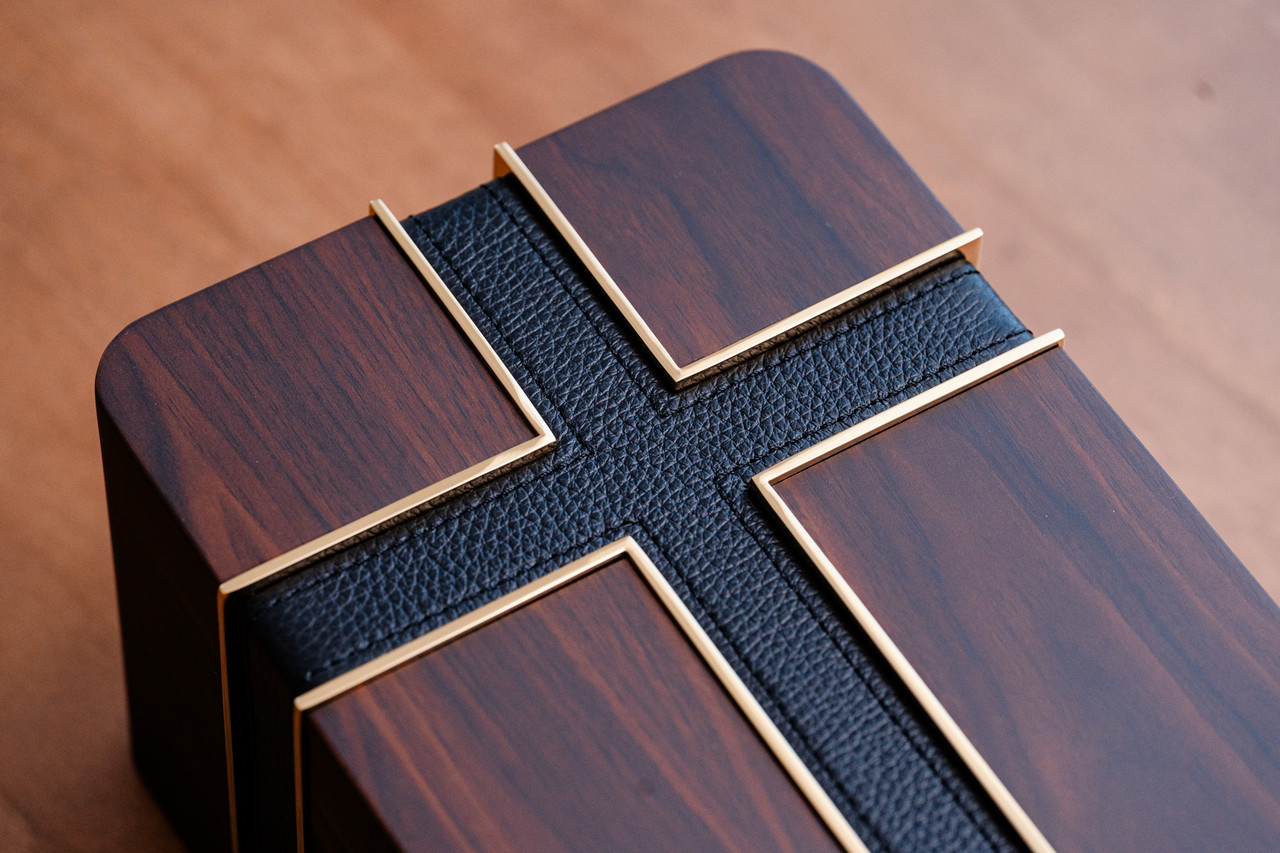 The Aurea Cross urn combines refined design and symbolism. Crafted from durable MDF with a rich walnut veneer and a smooth satin finish, it offers the look of fine wood with contemporary precision. A real leather inlay forms a cross across the top and sides, framed by sleek metal accents in a gold finish.