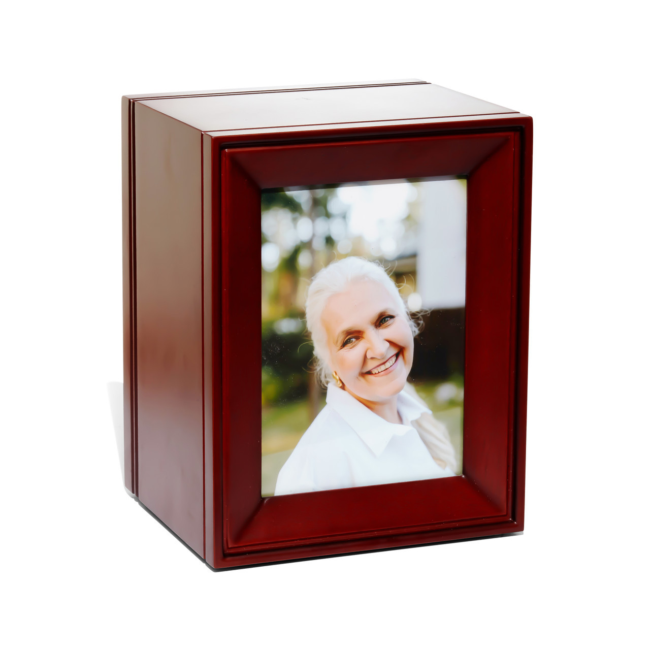 Remember your loved one with this classic picture-frame-inspired urn design. This full-size urn is made from medium-density fiberboard and has a cherry woodgrain-like finish. Features a photo slot which holds a 5"x7" photo.